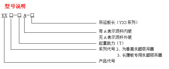 YX2系列磁吸吊器,即垂直用吸吊器,用於被吸磁性物料重力垂直於吸吊器永磁吸盤面的場合,吸、放料動作自動完成。該系列產(chǎn)品1988年通過省級鑒定,1990年獲得湖南省優(yōu)質(zhì)產(chǎn)品稱號。