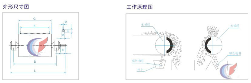 這種系列是將圓弧形的永久磁鐵固定在軸上,而 使非磁性的轉(zhuǎn)筒沿著磁鐵圓周旋轉(zhuǎn)的磁輥。 從動作原理圖上可以看出,被處理的原料從上面 供給后,磁性雜質(zhì)通過磁輥的表面時就被磁鐵吸引 ,隨著轉(zhuǎn)筒的旋轉(zhuǎn),被吸